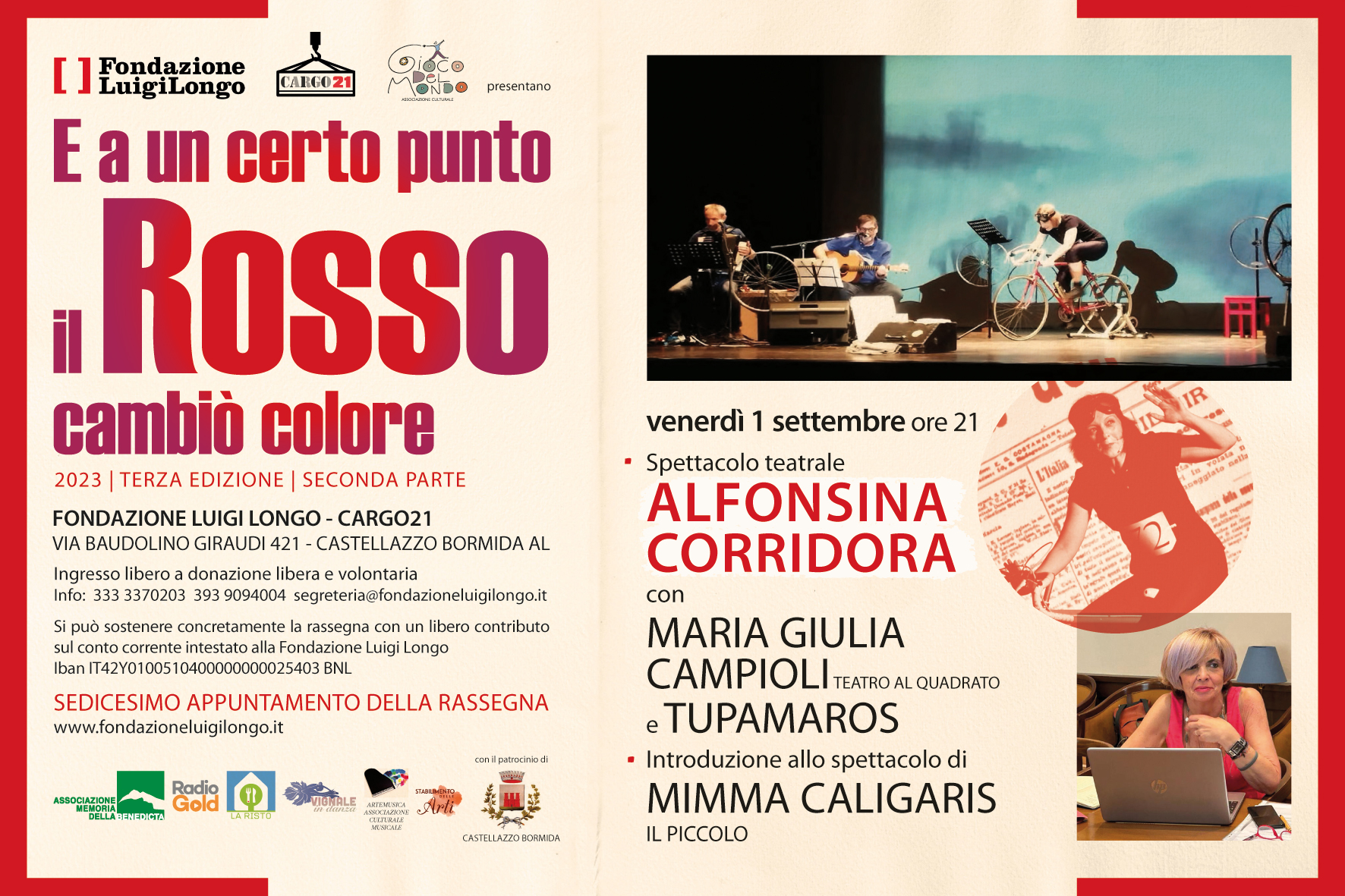 Stasera, venerdì 1° settembre, alla Fondazione Luigi Longo (via Baudolino Giraudi 421- Castellazzo Bormida), per la rassegna “E a un certo punto il rosso cambiò colore”, andrà in scena lo spettacolo “Alfonsina Corridora” con Giulia Maria Campioli e i Tupamaros, che prima dello spettacolo dialogheranno con la giornalista Mimma Caligaris. Inizio ore 21, ingresso libero.