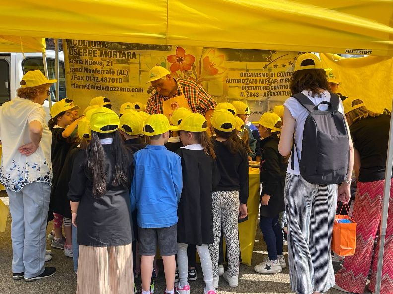 Festa di fine anno scolastico al Mercato di Campagna Amica. E’ stato così che piazza Castello, a Casale Monferrato, si è colorata di giallo grazie alla presenza degli alunni della primaria “Martiri della Libertà” che, ‘armati’ di cappellino Coldiretti e ruota della stagionalità, hanno riconosciuto e toccato con mano le produzioni a chilometro zero.