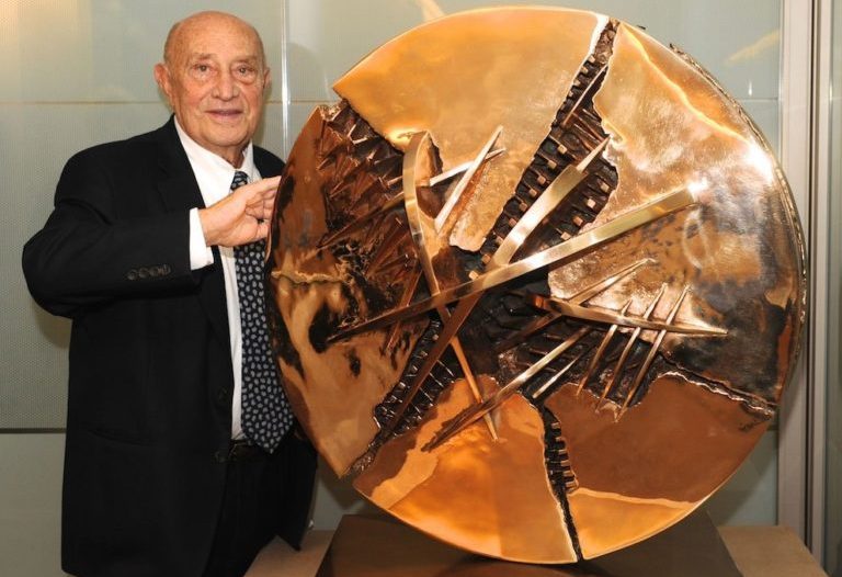 L'artista Arnaldo Pomodoro (99 anni oggi), accanto ad una delle sue sculture