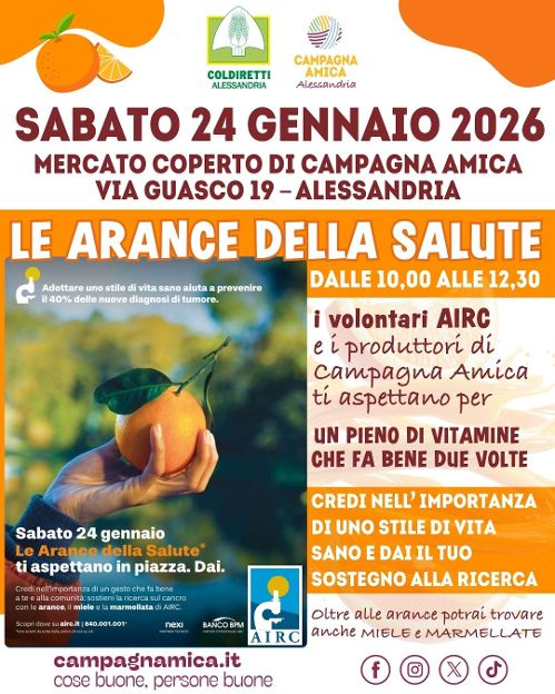 Domani, sabato 24 gennaio, al Mercato Coperto di Campagna Amica (via Guasco) dalle 10 alle 12.30, saranno disponibili le “Arance della Salute”, promosse da AIRC per dare nuova forza ai ricercatori nella lotta contro i tumori.