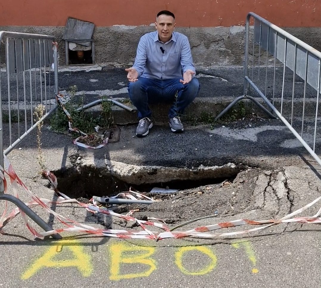 Emanuele Locci davanti ad un buco transennato in via De Giorgi