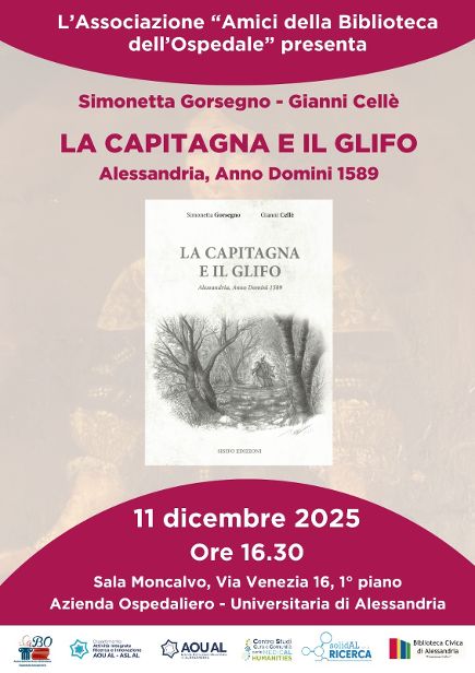 Domani, giovedì 11 dicembre, alle 16.30, la sala Moncalvo dell’Ospedale di Alessandria ospiterà la presentazione del libro “La Capitagna e il Glifo”, organizzata dall’Associazione Amici della Biblioteca dell’Ospedale. Il libro, scritto da Simonetta Gorsegno e Gianni Cellè (Sisifo Edizioni), narra la storia di una giovane donna in cerca di riscatto, in una città, l’Alessandria del 1589, oppressa dal dominio straniero, tra una rivolta soffocata e la forza della speranza. INGRESSO LIBERO.