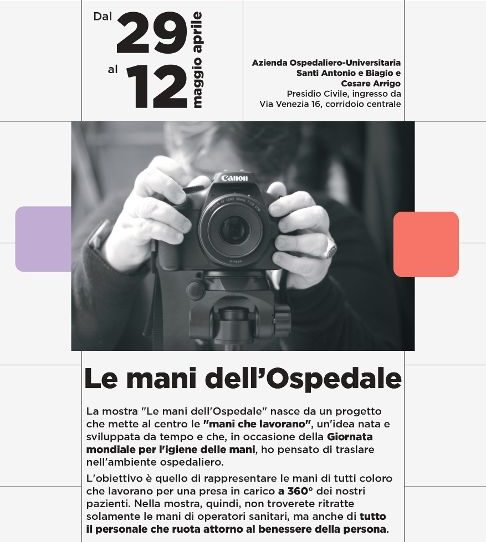In occasione della Giornata mondiale per l’igiene delle mani (5 maggio) l’Azienda Ospedaliero–Universitaria di Alessandria ha organizzato la mostra “Le mani dell’ospedale”, esposizione degli scatti di Lucia Voltaggio, fotografa e dipendente della struttura, che ha immortalato le “mani che lavorano” all’interno dei presidi ospedalieri alessandrini. Iniziata ieri, l’esposizione durerà fino a domenica 12 maggio.