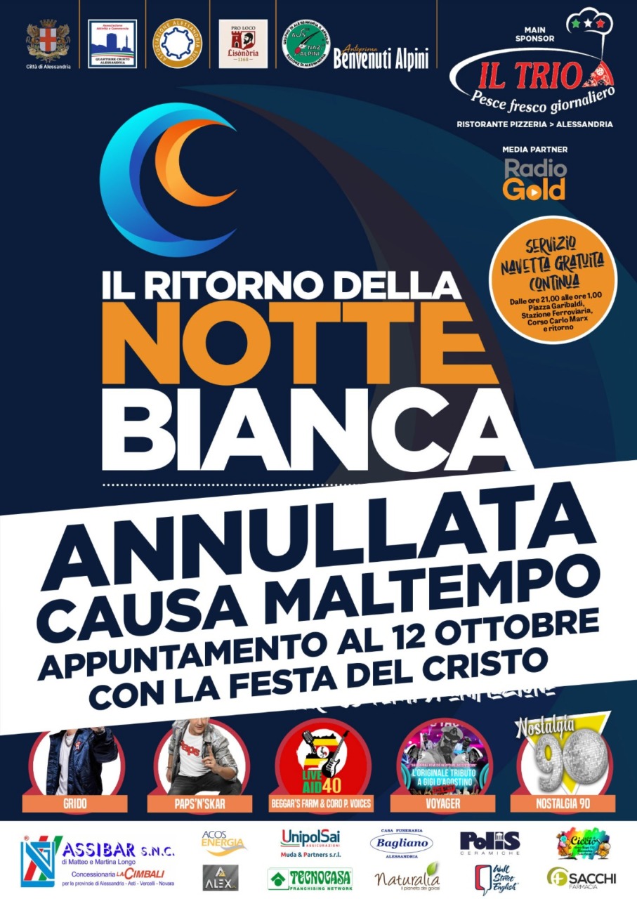 L’associazione dei commercianti del Quartiere Cristo informa che, avendo constatato le previsioni meteorologiche avverse, ha deciso di annullare la Notte Bianca prevista per sabato 13 settembre.
