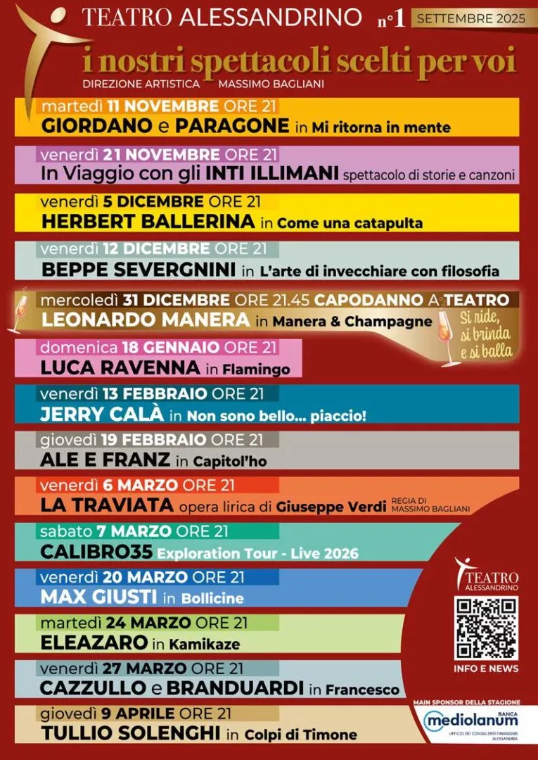In anticipo la presentazione, in anticipo gli spettacoli. La nuova stagione del Teatro Alessandrino  comincia prima rispetto all’anno scorso, a novembre, con 4 spettacoli in più in calendario, ben 14, tra musica, comicità e cultura, per terminare ad aprile. La proprietà della famiglia Pasquale (nel 2026 l’Alessandrino compirà 60 anni) rappresenta con orgoglio l’unico contenitore teatrale attivo di Alessandria, che lavora privatamente, senza contributi pubblici, basandosi solo sulla forza economica e sulla capacità imprenditoriale di Paolo Pasquale.