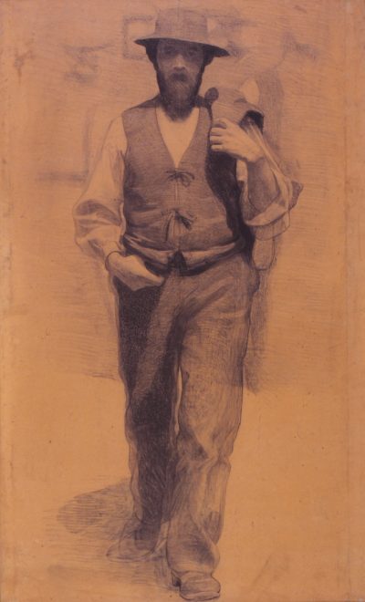 L’opera “Studio di figura maschile” è stata richiesta in prestito per il suo significato allusivo alle tensioni sociali di un’epoca di grandi speranze. Il carboncino su carta da spolvero fu acquistato dal Comune nel 1940, da Nerina Del Conte Pellizza, unitamente al dipinto “L’annegato” dello stesso autore. Il disegno rappresenta la figura maschile centrale del ‘Quarto Stato’, quella del contadino in maniche di camicia e farsetto che avanza con decisione verso l’osservatore. Il volto teso e lo sguardo deciso avanzano verso un futuro greve di minacce e sfide.