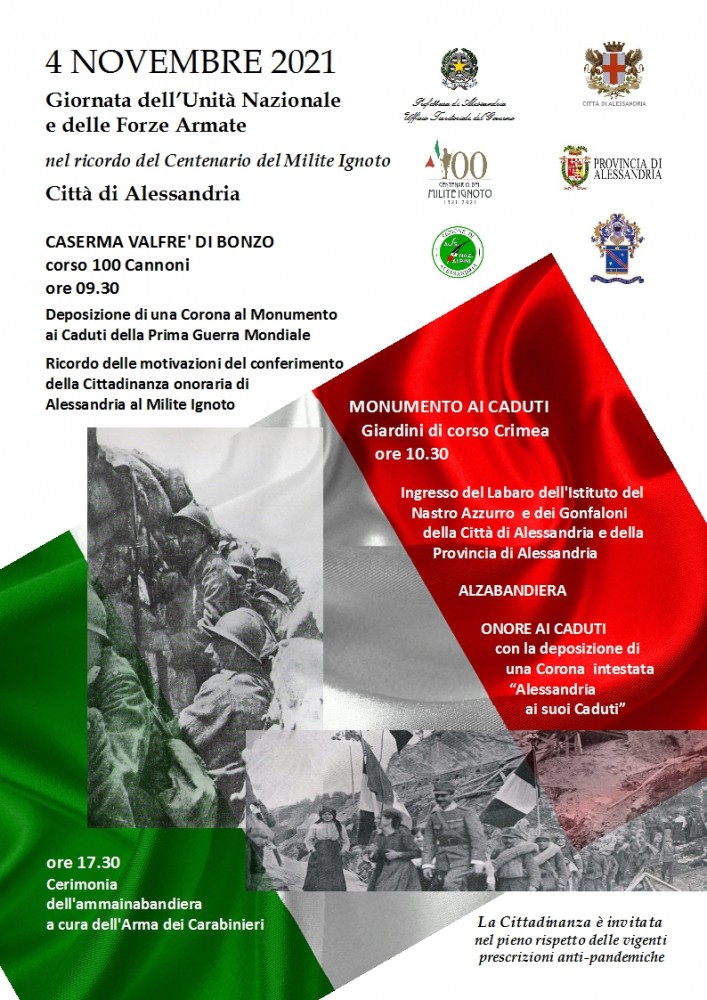 Infine, per quanto riguarda direttamente la Città di Alessandria – nella consapevolezza sia dei tanti Figli della terra alessandrina che hanno perso la vita durante il primo conflitto bellico e per la costruzione dell’Unità d’Italia, sia di quanto la presenza dei Militari di stanza nelle Caserme alessandrine abbia caratterizzato la vita della Città negli ultimi secoli – va ricordato che il Consiglio Comunale, con propria Deliberazione n. 84 del 30 settembre 2020, ha solennemente conferito la cittadinanza onoraria al “Milite Ignoto”, a cui già è dedicata una via cittadina (viale Milite Ignoto, rione Orti).