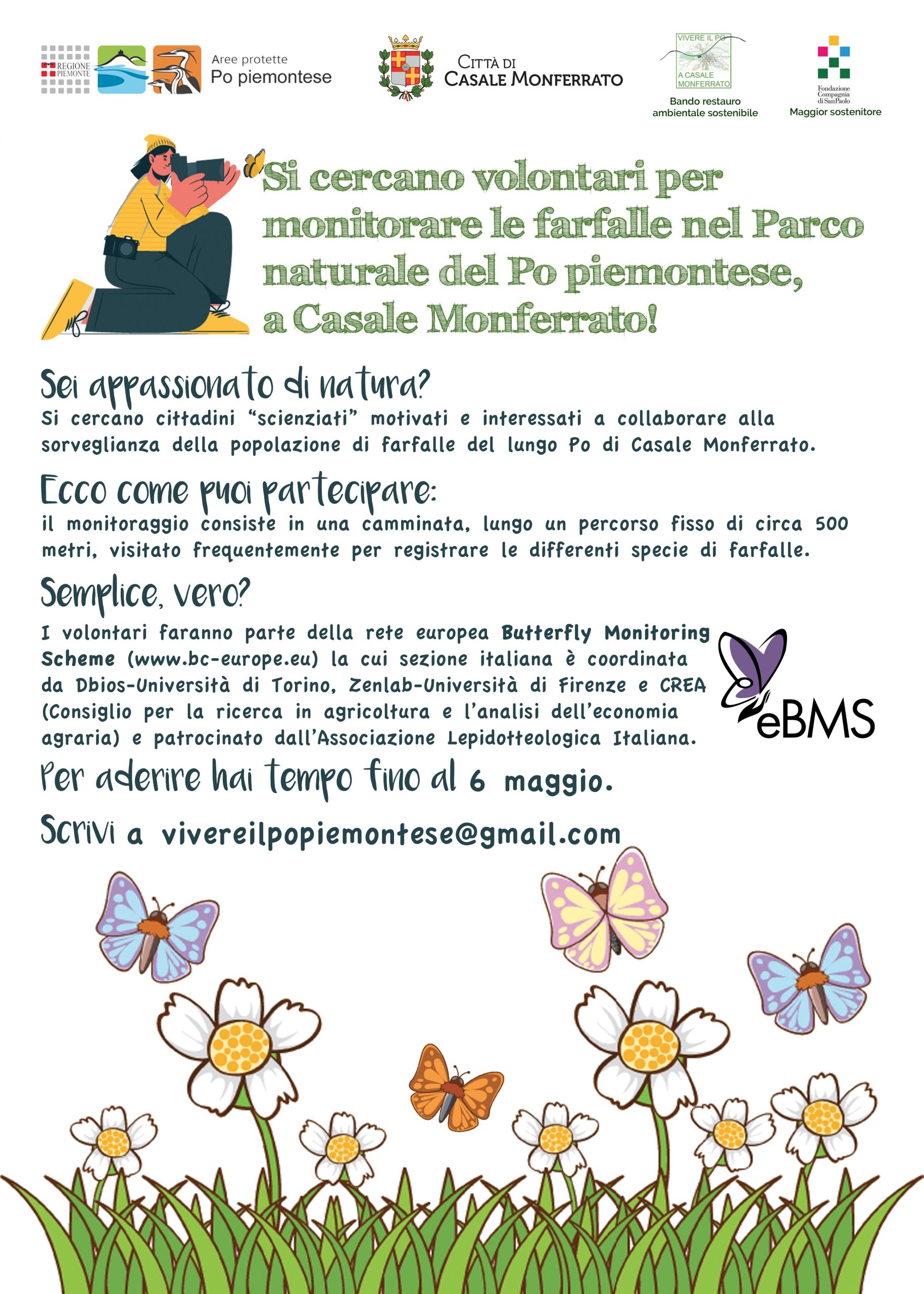 Una chiamata rivolta agli appassionati di natura, cittadini, studenti, insegnanti, pensionati, con l’obiettivo di reclutare cittadini scienziati motivati e interessati a collaborare alla sorveglianza della popolazione di farfalle del lungo Po di Casale Monferrato, nel Parco naturale del Po piemontese.