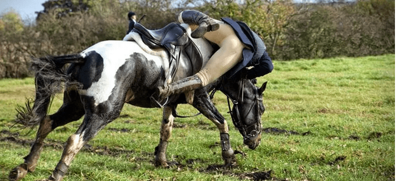 Quando cadi – Cerca di lanciarti più lontano possibile dal cavallo per non rischiare di finire sotto i suoi zoccoli. L’ideale sarebbe atterrare sui piedi, piegare le ginocchia appena tocchi terra per poi raggomitolarti e rotolare via dal cavallo per riparare gli organi vitali, proteggendo collo e testa con le braccia.