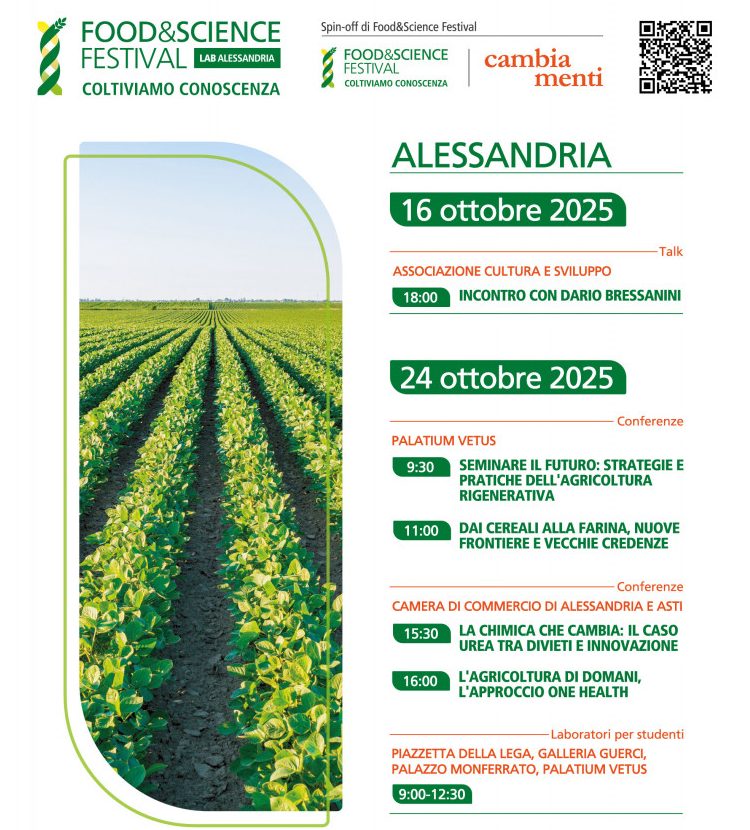 Torna per il 2° anno consecutivo il Food&Science Festival Lab Alessandria, più ricco di contenuti, date e proposte. L’evento nasce come spin-off (derivato) del Food&Science Festival di Mantova, appuntamento di rilevanza internazionale dedicato alla scienza e all’innovazione nella produzione e consumo del cibo, dalla coltivazione alla trasformazione e alla tavola.
