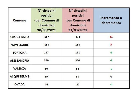 Nella provincia di Alessandria 4 decessi e + 128 nuovi contagi di cui nessuno nella città di Alessandria che registra – 9 casi
