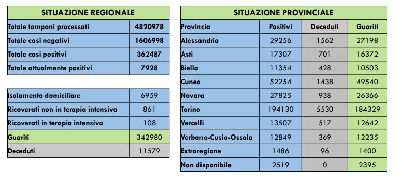 Il totale dei casi positivi diventa quindi 362.487 così suddivisi su base provinciale: 29.256 Alessandria, 17.307 Asti, 11.354 Biella, 52.254 Cuneo, 27.825 Novara, 194.130 Torino, 13.507 Vercelli, 12.849 Verbano-Cusio-Ossola, oltre a 1.486 residenti fuori regione, ma in carico alle strutture sanitarie piemontesi. I restanti 2.519 sono in fase di elaborazione e attribuzione territoriale.