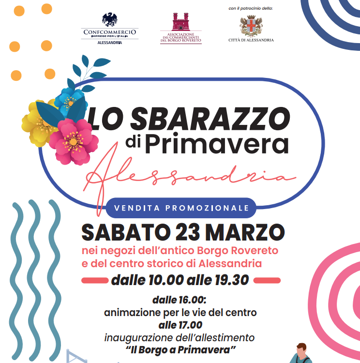 Sabato 23 marzo 2024 si terrà, presso le vie del centro di Alessandria, una giornata di animazione dello shopping organizzata dall’Associazione Commercianti di Borgo Rovereto, in collaborazione con Confcommercio di Alessandria e con il Patrocinio del Comune di Alessandria, con l’obiettivo di supportare le attività commerciali con un programma di diverse iniziative. Un’intera giornata di animazione dello shopping con lo Sbarazzo, l’inaugurazione degli allestimenti “Il Borgo a primavera” e la parata fiorita per le vie.