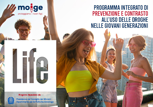 Il progetto “Life” di MOIGE, Movimento Italiano Genitori, finanziato dal Dipartimento per le Politiche Antidroga, vuole sensibilizzare genitori, insegnanti e, soprattutto, ragazzi tra gli 11 e i 19 anni, riguardo questo tema, analizzando tutte le criticità che tale questione comporta e facendo riflettere i partecipanti, e non solo, sugli effetti delle sostanze stupefacenti sulla salute fisica e psichica.