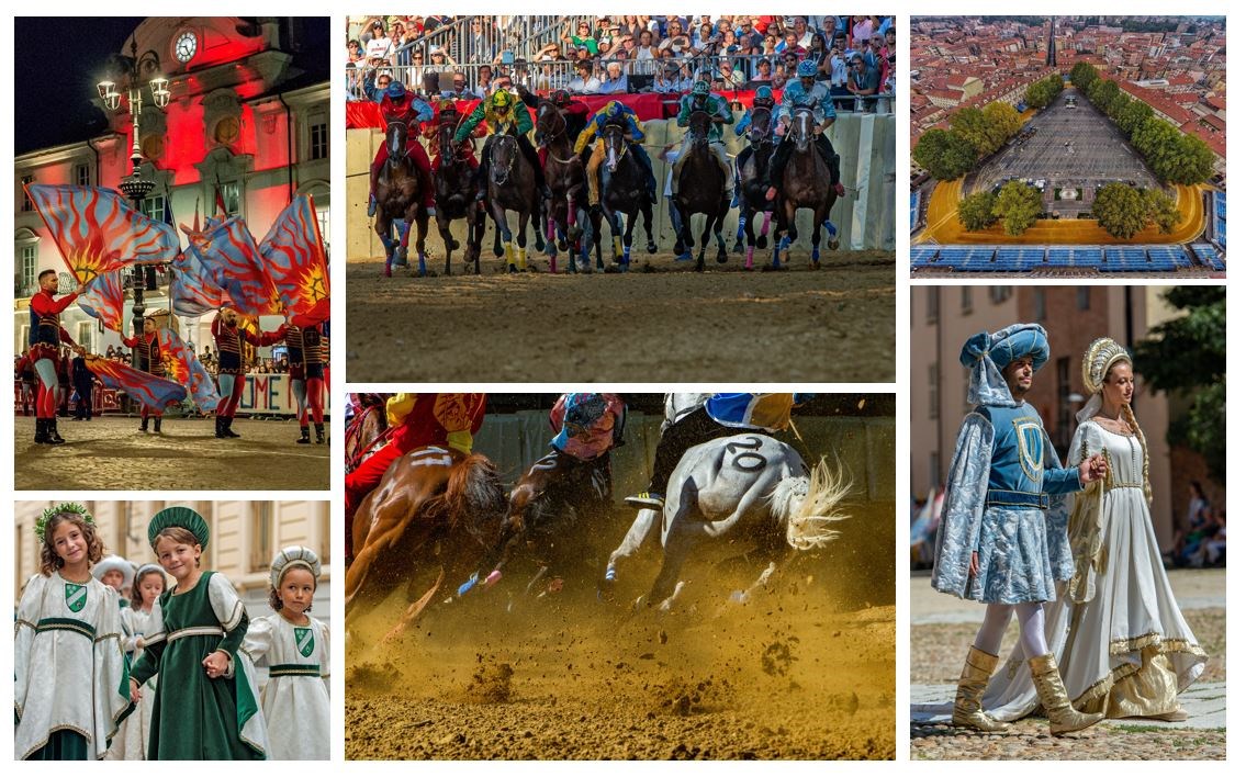 Una scarica di adrenalina con 20 cavalli montati a pelo (senza sella), sulla pista allestita nella centralissima piazza Alfieri, per aggiudicarsi il famoso Palio, il grande “Drappo” di velluto con le insegne di Asti. Il tutto circondato da un corteo storico con oltre 1.200 figuranti in costume medievale, imponente rievocazione storica che ripropone quadri viventi a rappresentare fatti realmente accaduti della storia astigiana.
