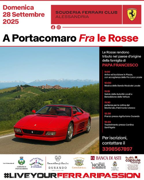 È con questa citazione che l’evento di domenica si preannuncia come un’occasione unica, in grado di unire passione per le auto di lusso, la storia e la tradizione. Il 28 settembre Portacomaro (AT) accoglierà ben 41 equipaggi di Ferrari, tutti iscritti allo Scuderia Ferrari Club di Alessandria, che hanno deciso di rispondere all’invito della comunità locale di trovarsi nel paese. L’incontro rappresenta un’ulteriore occasione per omaggiare il dolce e sincero ricordo di Papa Francesco, legato a doppio filo a Portacomaro.
