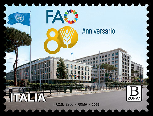 Il francobollo è stampato dall’Istituto Poligrafico e Zecca dello Stato S.p.A., in rotocalcografia, su carta bianca, patinata neutra, autoadesiva con imbiancante ottico. Bozzetto a cura della FAO e ottimizzato dal Centro Filatelico dell’Officina Carte Valori e Produzioni Tradizionali dell’Istituto Poligrafico e Zecca dello Stato S.p.A. La vignetta raffigura, in primo piano, il logo dell’80° anniversario della FAO, Organizzazione delle nazioni Unite per l’alimentazione e l’agricoltura, fondata il 16 ottobre 1945, che richiama gli Obiettivi di Sviluppo sostenibile, il marchio istituzionale della FAO e il motto “Fiat panis”, rappresentato simbolicamente dalla spiga di grano integrata nel numero 80. Sullo sfondo, è riprodotta la sede FAO di Roma, nel quartiere Aventino, con la bandiera dell’ONU che svetta in alto, a sinistra. Completano il francobollo la legenda “ANNIVERSARIO”, la scritta “ITALIA” e l’indicazione tariffaria “B zona 1”.