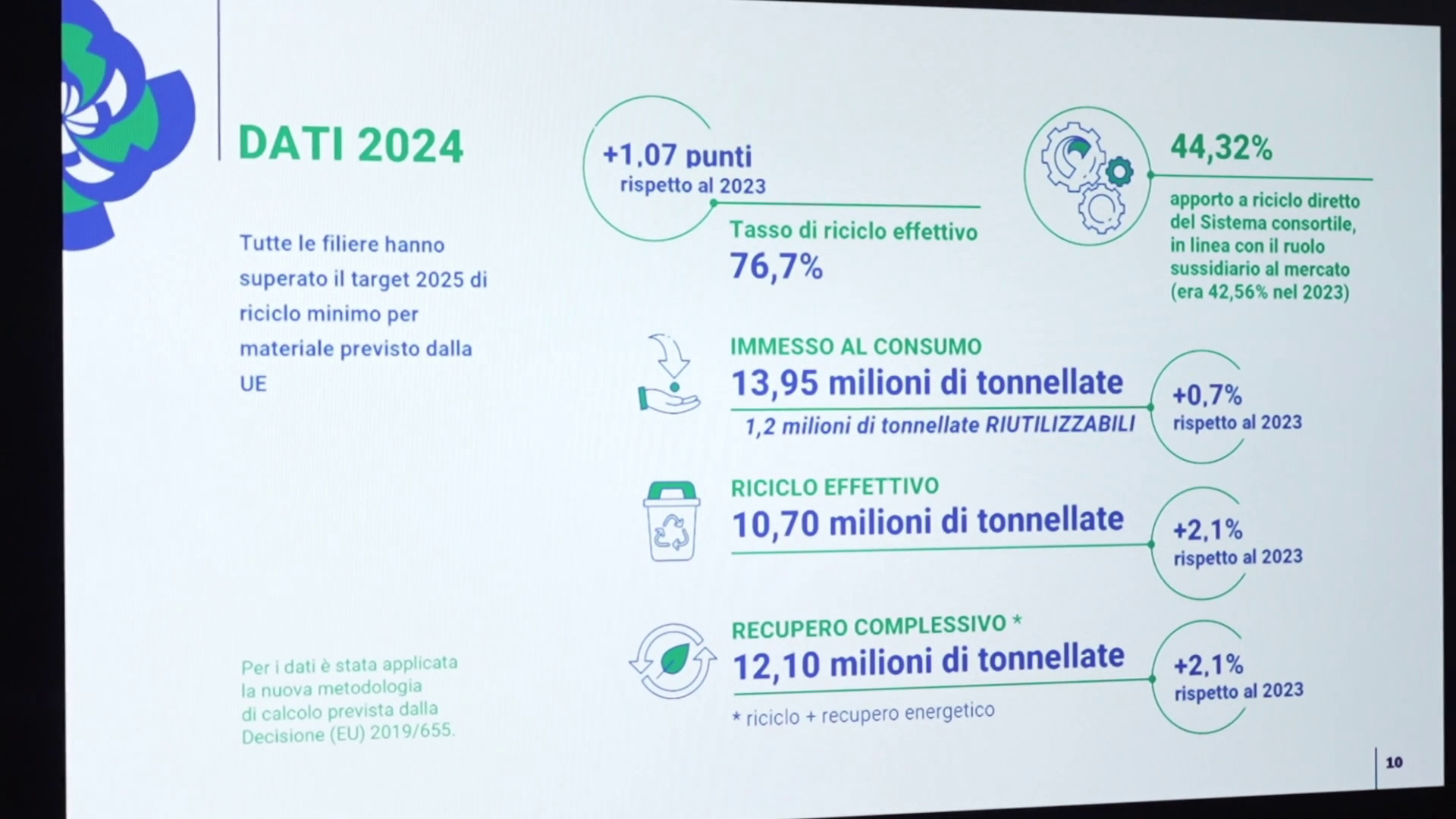 MILANO (ITALPRESS) – Nel 2024 l’Italia ha riciclato il 76,7% degli imballaggi immessi sul mercato, circa 10.700.000 tonnellate: una crescita di circa un punto percentuale rispetto al risultato dell’anno precedente. In leggera crescita, sempre nel 2024, anche i quantitativi di imballaggi riutilizzati. È la fotografia scattata da Conai nel corso della presentazione della Relazione generale.f28/fsc/gtr