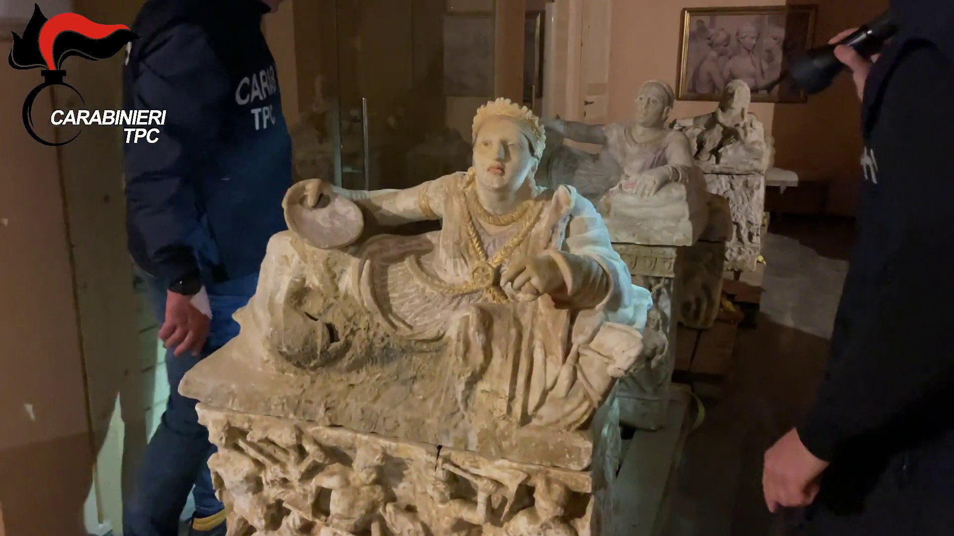 PERUGIA (ITALPRESS) – I Carabinieri del Comando Tutela Patrimonio Culturale hanno scoperto uno scavo abusivo nella zona fra Chiusi e Città della Pieve nel territorio di quest’ultimo comune ed il ritrovamento di importanti reperti archeologici etruschi. In particolare, venivano individuate quali eventuali responsabili due persone, nei confronti delle quali si procede per i reati di furto e ricettazione di beni culturali e soprattutto sequestrate 8 urne litiche etrusche, due sarcofagi e il relativo corredo funerario di età ellenistica del III secolo a.C. Le urne, tutte integre, sono in travertino bianco umbro, in parte decorate ad altorilievi con scene di battaglie, di caccia e con fregi, alcune delle quali conservano pigmenti policromi e rivestimenti a foglia d’oro, altre con la raffigurazione del mito di Achille e Troilo. Dei due sarcofagi, uno è al momento rappresentato dalla sola copertura e l’altro completo dello scheletro del defunto. Un preliminare studio scientifico delle urne redatto dai funzionari archeologi del Ministero della Cultura conferma l’appartenenza dei beni a un unico contesto funerario, consistente in una tomba a ipogeo riconducibile a una importante famiglia del luogo, i “PULFNA”. Particolarmente ricco il corredo funebre (suppellettili e vasellame, fittile e metallico) tra cui quattro specchi in bronzo, uno dei quali con l’antica divinizzazione di Roma e della lupa che allatta soltanto Romolo, un balsamario contenente ancora tracce organiche del profumo utilizzato in antichità, un pettine in osso, situle e oinochoe in bronzo, comunemente utilizzati dalle donne etrusche durante banchetti e simposi.