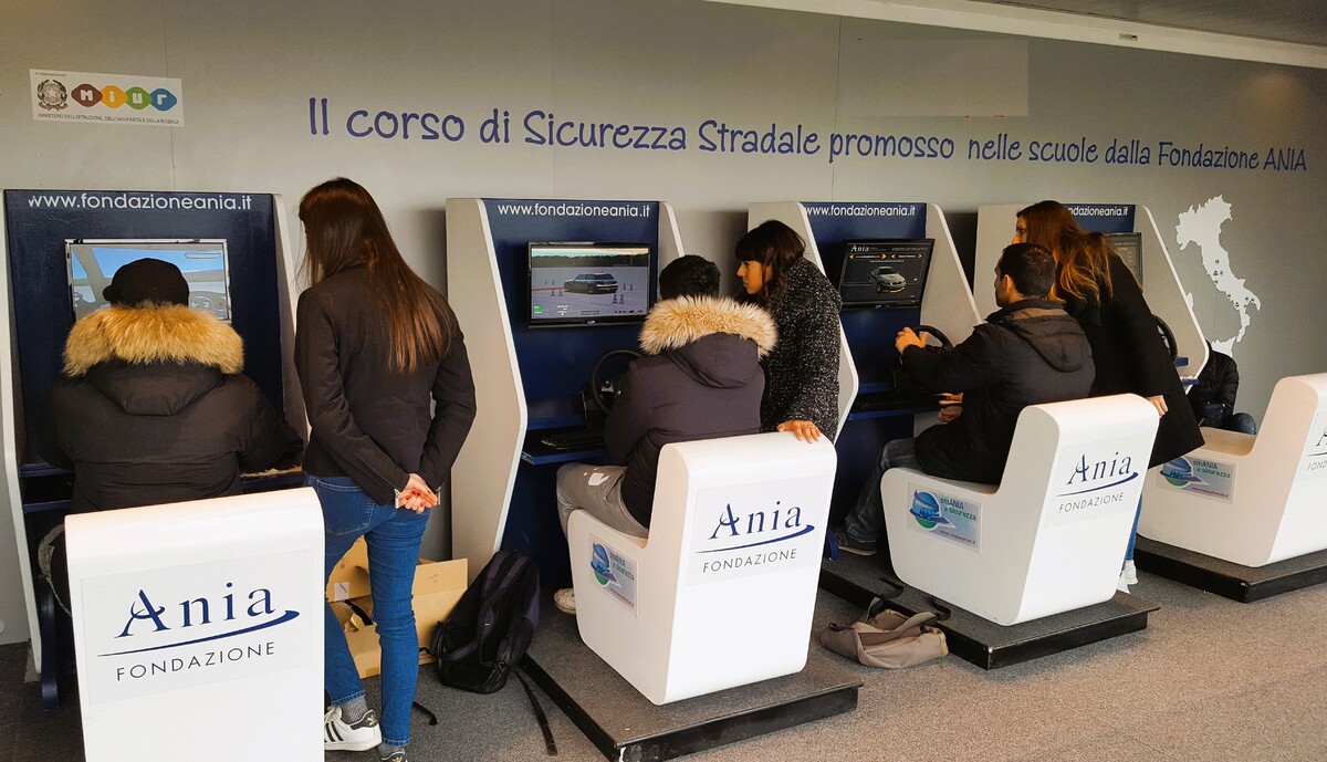 Nelle ore successive gli studenti si sposteranno in un’aula in cui sono stati allestiti i simulatori di guida della Fondazione ANIA, grazie ai quali avranno la possibilità di mettere in pratica le nozioni apprese durante la lezione teorica. Sotto la supervisione di piloti ed istruttori gli studenti potranno effettuare esercizi di varia tipologia come l’evitamento di un ostacolo improvviso, il controllo del veicolo in caso di aqua-planing o su fondo stradale ghiacciato. Le prove si concluderanno con una dimostrazione dei rischi della guida in stato psicofisico alterato: i simulatori, infatti, sono equipaggiati con un software in grado di ricostruire alla perfezione ciò che accade nel cervello se ci si mette al volante sotto l’effetto di alcol o di alcune droghe (oppiacei, cannabis, anfetamine).