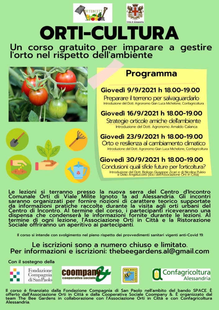 Il progetto patrocinato dal Comune di Alessandria vede come partner dell’iniziativa Confagricoltura Alessandria, i cui esperti contribuiranno con importanti interventi alle lezioni, la Cooperativa Sociale Coompany & , capofila del progetto vinto nel bando SPACE della Fondazione Compagnia di San Paolo che finanzia il corso e il team The Bee Gardens che cura l’organizzazione e la realizzazione delle lezioni, in collaborazione con l’Associazione Orti in Città.