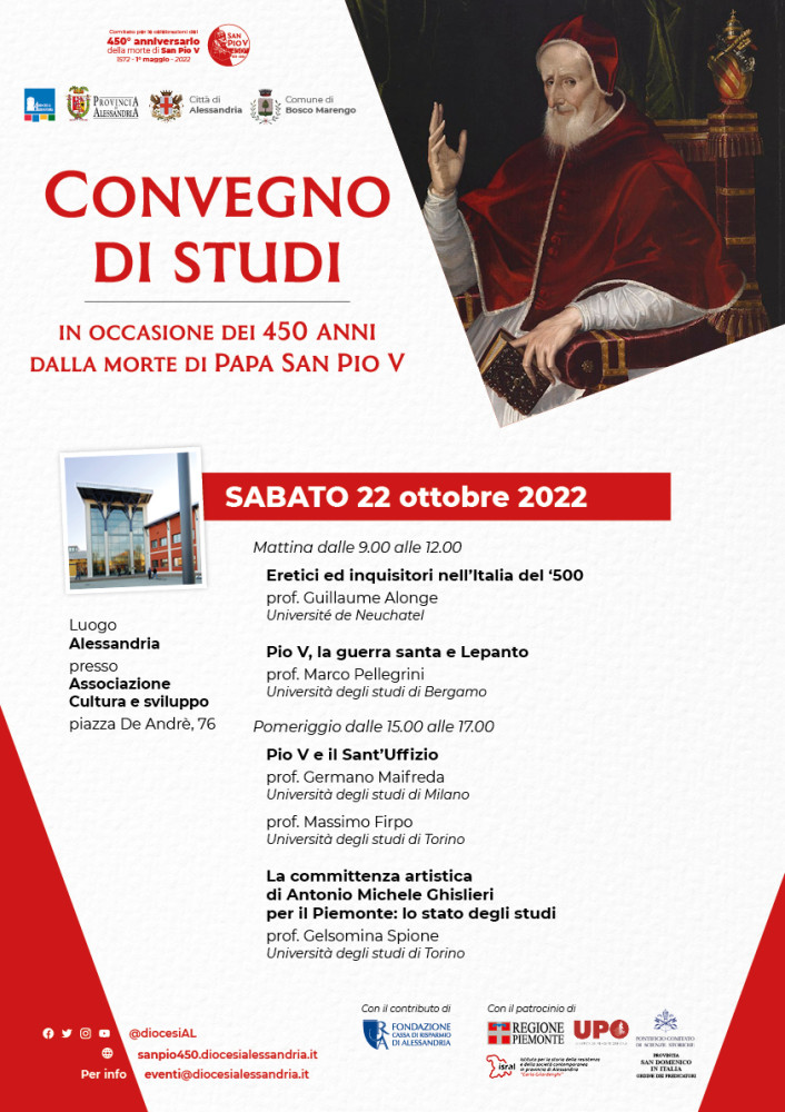 In occasione del 450° anniversario della morte di Papa San Pio V (1572 – 2022), la Diocesi di Alessandria, la Provincia di Alessandria, il Comune di Alessandria e il Comune di Bosco Marengo, con il fondamentale sostegno della Fondazione Cassa di Risparmio di Alessandria, hanno costituito un Comitato per le celebrazioni.