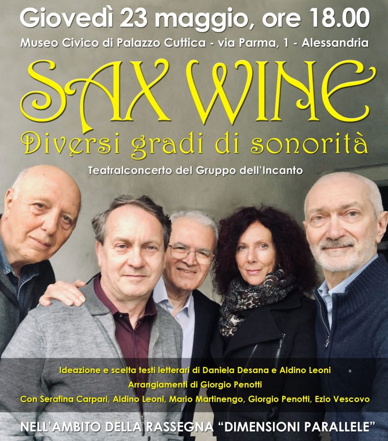 Giovedì 23 maggio alle ore 18, presso il Museo Civico di Palazzo Cuttica (via Parma 1), ASM Costruire Insieme e il Comune di Alessandria, nell’ambito della terza edizione della rassegna “Dimensioni parallele”, propongono “Sax Wine – Diversi gradi di sonorità”, Teatralconcerto del Gruppo dell’Incanto. Lo spettacolo, ideato da Daniela Desana e Aldino Leoni, verrà interpretato, cantato e suonato da Serafina Carpari, Aldino Leoni, Mario Martinengo, Giorgio Penotti e Ezio Vescovo. Ingresso gratuito, fino ad esaurimento posti.