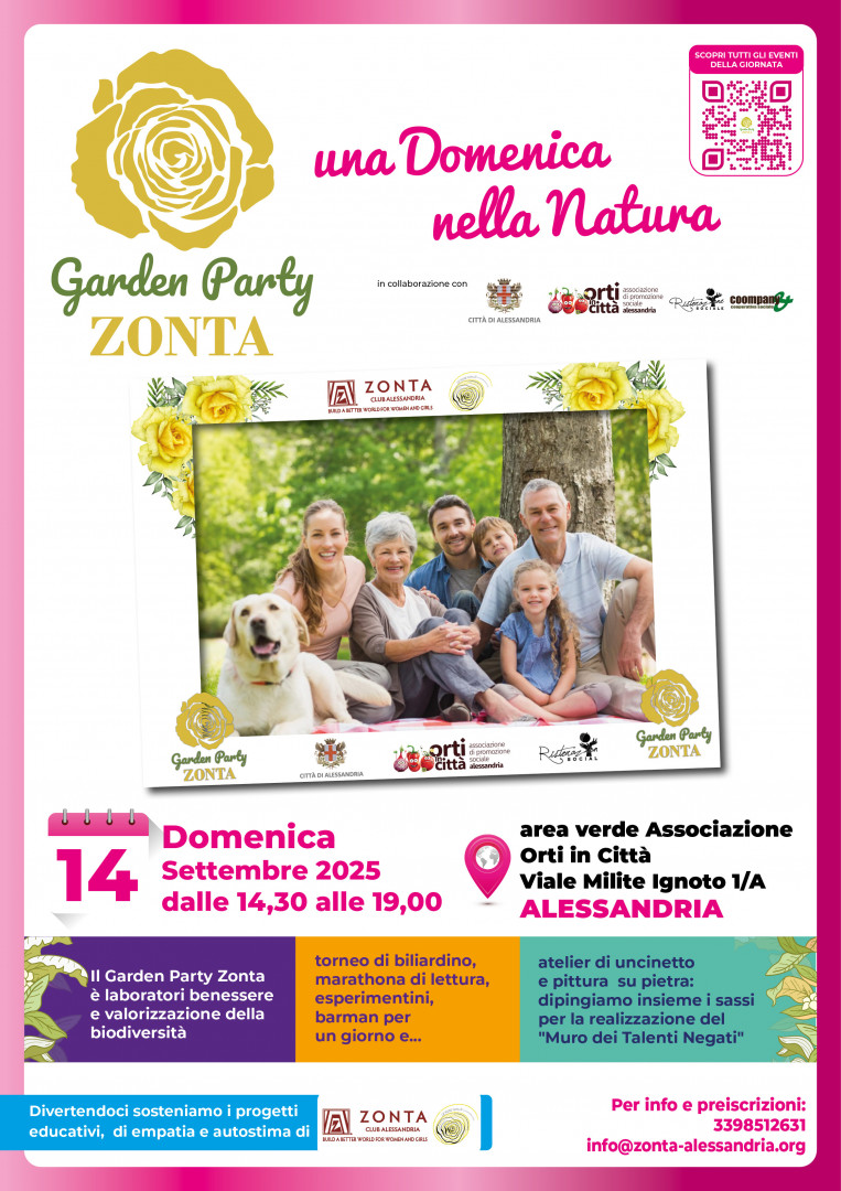 Zonta Club Alessandria, con il Garden Party Zonta, apre l’anno sociale ed augura buon anno scolastico con un’iniziativa volta a sostenere scuola e studenti. L’evento, organizzato con la collaborazione del Comune di Alessandria, si svolgerà domenica 14 Settembre negli spazi del Centro d’Incontro Orti ad Alessandria e, per l’occasione, la Ristorazione Sociale sarà eccezionalmente aperta a pranzo.
