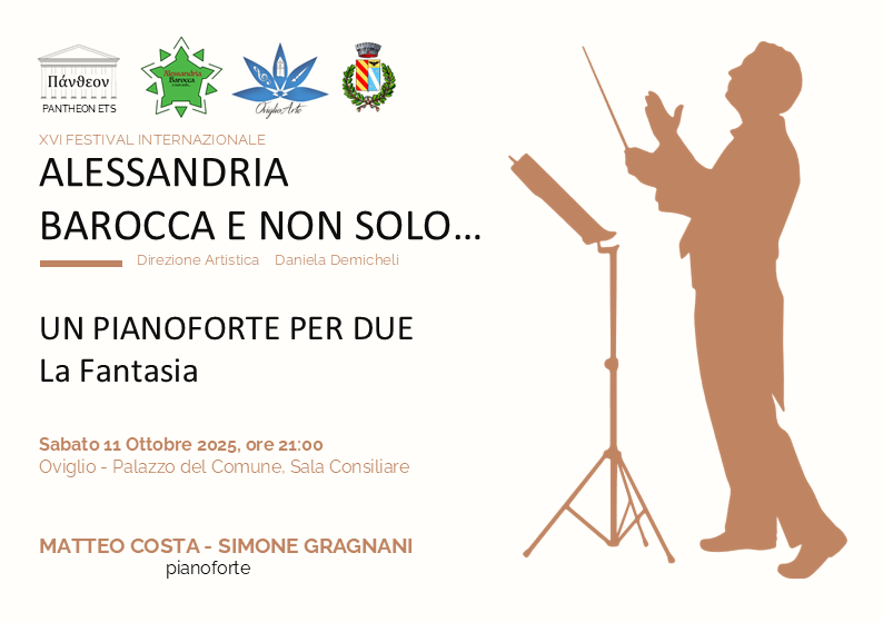 Sabato 11 ottobre, alle ore 21, la Sala Consiliare del Comune di Oviglio accoglierà il primo appuntamento autunnale del Festival Internazionale “Alessandria Barocca e non solo…”, in collaborazione con l’Associazione OviglioArte e con il Patrocinio del Comune. Il concerto, significativamente intitolato “Un pianoforte per due – La Fantasia”, vedrà protagonisti Matteo Costa e Simone Gragnani, due pianisti di consolidata esperienza e fine sensibilità interpretativa, noti per la profondità del loro approccio e la raffinatezza del tocco.