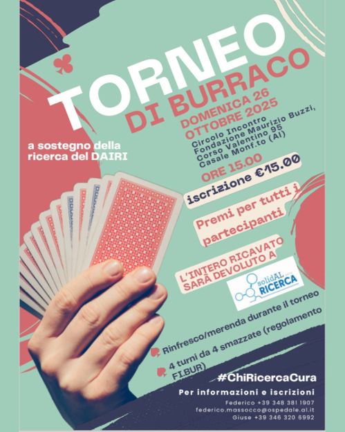 Una nuova iniziativa a Casale Monferrato per sostenere, in modo divertente, Solidal per la Ricerca, e quindi i progetti del DAIRI (Dipartimento Attività Integrate Ricerca e Innovazione), diretto da Antonio Maconi. Domenica 26 ottobre alle ore 15, al Circolo Incontro Fondazione Maurizio Buzzi (corso Valentino 95) andrà infatti in scena il torneo di burraco a sostegno della ricerca.
