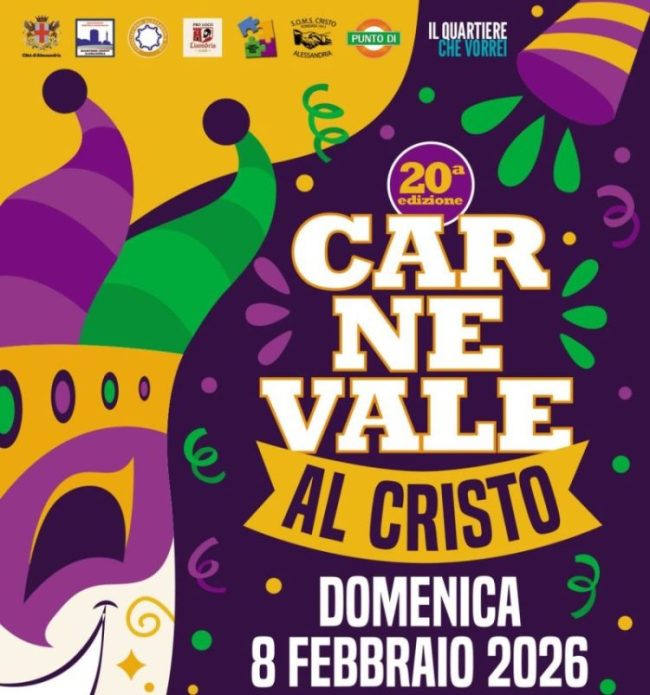 Dopodomani, domenica 8 febbraio, piazza Ceriana sarà colorata di coriandoli e maschere con animazione per grandi e piccoli. Gonfiabili, frittelle, dolci, attrazioni per grandi e piccoli, la pentolaccia, la baby dance e tante novità nell’evento promosso da tutte le associazioni del quartiere: Associazione Attività e Commercio Quartiere Cristo, Associazione Alessandria Sud, Pro loco Lisondria 1168, Punto Di, Soms, Centro Incontro Cristo, Le Parrocchie e le Scuole del Quartiere. Sarà un grande evento, il primo del 2026 al Quartiere Cristo, dove nel ricco programma di maschere e coriandoli nei giorni precedenti vedrà protagoniste anche la SOMS ed il Centro Incontro Cristo.