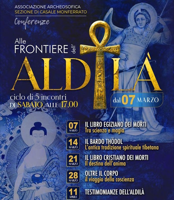Sabato 14 marzo alle ore 17, presso la sede di via Paleologi 24 a Casale Monferrato, si terrà la conferenza dal titolo “IL BARDO THODOL: L’ANTICA TRADIZIONE SPIRITUALE TIBETANA”, appuntamento del ciclo “Alle frontiere dell’al di là”. INGRESSO LIBERO.