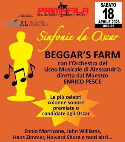 Protagonisti della serata saranno i Beggar’s Farm, insieme all’Orchestra del Liceo Musicale di Alessandria, diretta dal maestro Enrico Pesce, in un viaggio musicale attraverso alcune delle composizioni più amate e riconoscibili del grande schermo. Il programma proporrà infatti le più celebri colonne sonore premiate o candidate agli Oscar, rendendo omaggio a maestri indiscussi come Ennio Morricone, John Williams, Hans Zimmer, Howard Shore e molti altri.