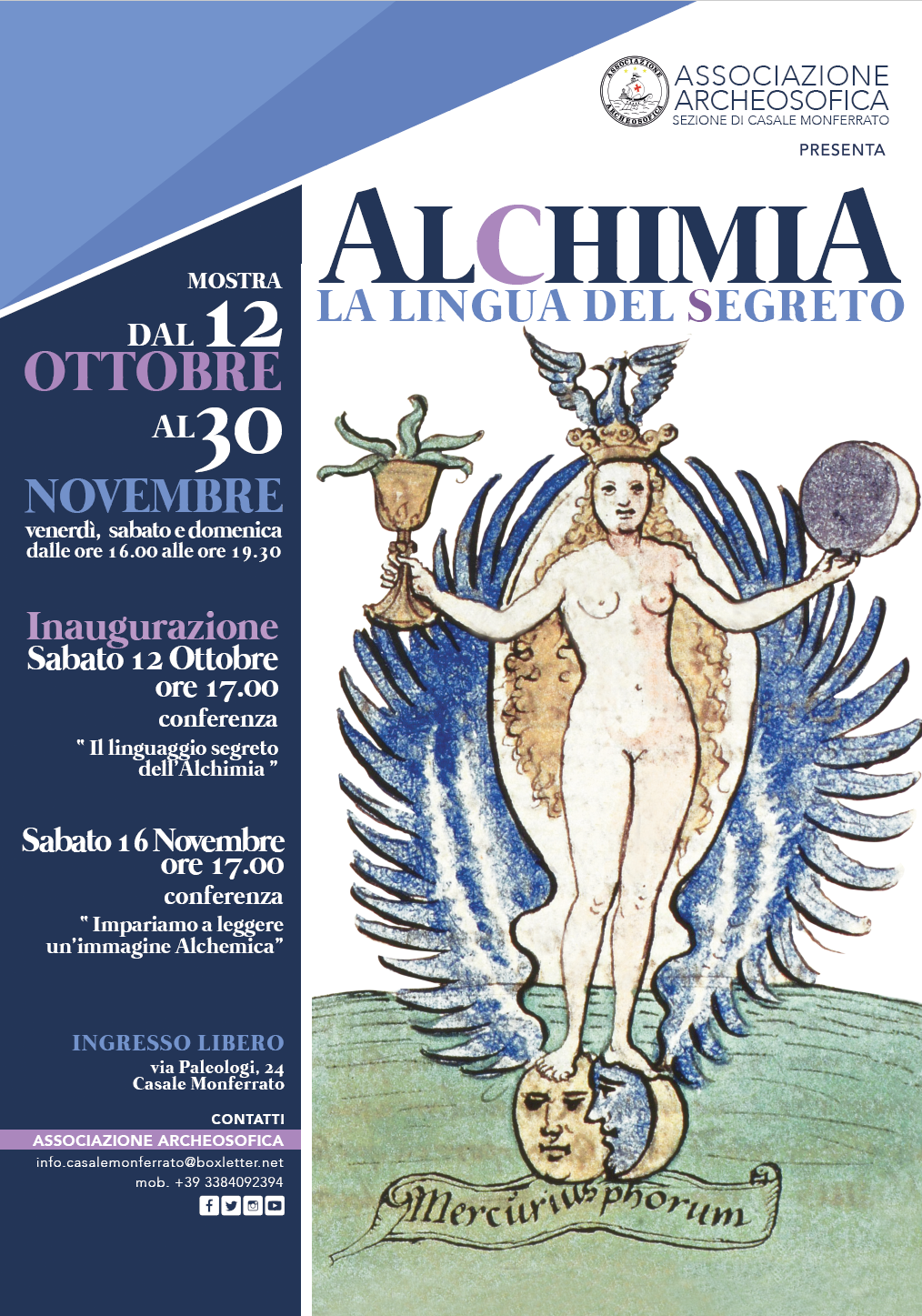 Sabato 12 ottobre alle ore 17, presso i locali dell’Associazione Archeosofica di Casale Monferrato (via Paleologi 24), si terrà una conferenza ad ingresso libero intitolata “Il linguaggio segreto dell’Alchimia” di inaugurazione ad un’interessante mostra itinerante di immagini alchemiche dal titolo: “Alchimia, la lingua del segreto”. La mostra rimarrà aperta dal 12 ottobre al 30 novembre e sarà visitabile nelle giornate di venerdì, sabato e domenica, dalle ore 16 alle ore 19.30.