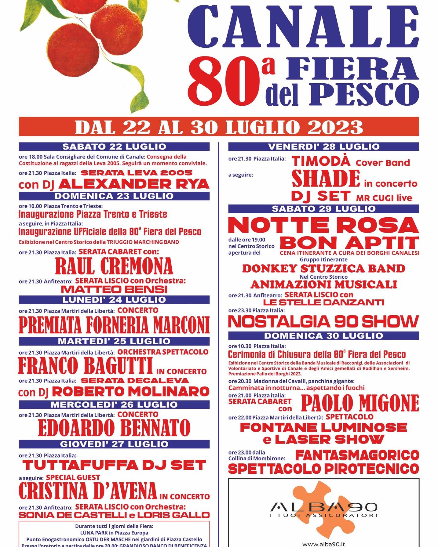 Dal 22 al 30 luglio nel centro storico di Canale si svolgerà la tradizionale Fiera del pesco con intrattenimento e enogastronomia: concerti di Premiata Forneria Marconi, Edoardo Bennato, Cristina D’Avena, Shade, cabaret con Raul Cremona e Paolo Migone, Notte Rosa e spettacoli pirotecnici.
