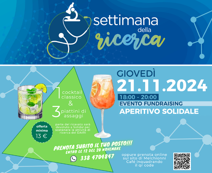 Con un’offerta minima di 13 €, i partecipanti potranno gustare un cocktail accompagnato da tre piattini di assaggi e allo stesso tempo contribuire al progresso della ricerca sanitaria sul territorio. Questa iniziativa rappresenta, inoltre, la chiusura di un percorso iniziato a settembre con i piatti speciali che a pranzo, all’interno del menù di Melchionni Cafè, per 10 settimane hanno permesso di sostenere la ricerca del DAIRI e di scoprire le cartoline dedicate alle parole della ricerca.