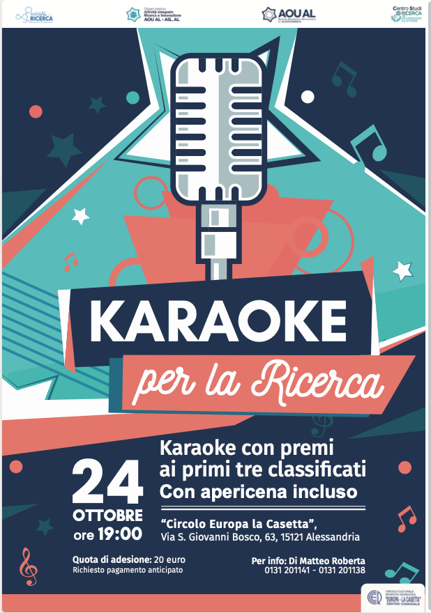 Domani, giovedì 24 ottobre, alle ore 19, il Circolo Europa “La Casetta“ di Alessandria ospiterà il “Karaoke per la Ricerca” che permetterà di raccogliere fondi a sostegno delle attività di ricerca del DAIRI, Dipartimento Attività Integrate Ricerca e Innovazione dell’Azienda Ospedaliero-Universitaria di Alessandria, diretto da Antonio Maconi.