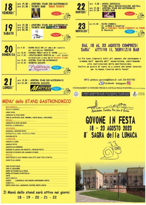L’ottava sagra della lumaca di Govone e ‘Govone in Festa’ si svolgeranno dal 18 al 23 agosto 2023. Lo stand gastronomico sarà aperto tutte le sere dalle 20:00 e offrirà un menu tipico piemontese con specialità a base di lumache.