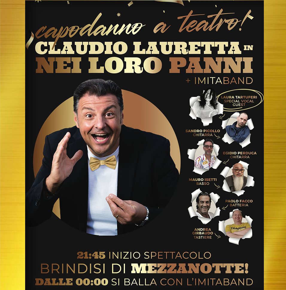 - Martedì 31 dicembre – ore 21.45 – Cabaret: Claudio Lauretta in “Nei loro panni” – Si ride, si brinda all’anno nuovo e si balla. Prezzi: platea € 50, galleria € 35+prevendita.