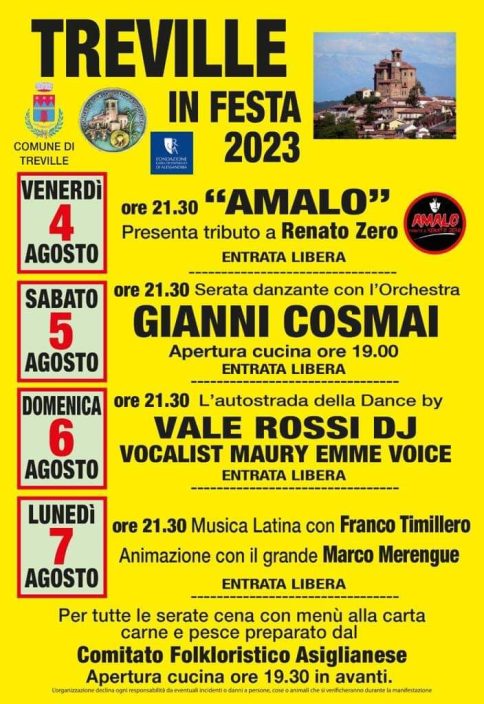 Treville in Festa 2023 è una manifestazione che si tiene ogni anno a Treville, in provincia di Alessandria, dal 4 al 7 agosto. La festa si svolge in Piazza Devasini e offre un programma ricco di eventi per tutti i gusti.