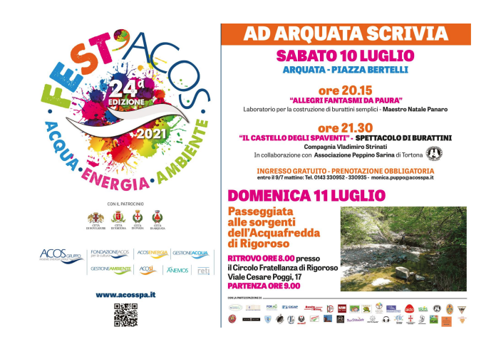 Fest’Acos Acqua Energia Ambiente, dopo il successo del doppio appuntamento a Novi Ligure l’ultimo weekend di giugno, sabato 10 e domenica 11 luglio farà tappa ad Arquata. Sabato 10 luglio, in piazza Bertelli, alle ore 20,15, si terrà un laboratorio di burattini denominato “Allegri fantasmi di paura” con il maestro Natale Panaro al quale seguirà, alle 21,30, lo spettacolo di burattini “Il castello degli spaventi” della Compagnia Vladimiro Strinati, in collaborazione con l’Atelier Peppino Sarina di Tortona.