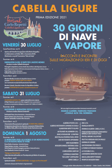 La manifestazione di quest’anno, organizzata in collaborazione con MuMa (Musei del Mare e delle Migrazioni) di Genova, CISEI (Centro Internazionale Studi Emigrazione Italiana) di Genova- ISRAL (Istituto per la storia della resistenza e della società contemporanea in provincia di Alessandria)- Associazione MUSA– PRO LOCO e-Associazione ROBA DA STREIJE di Cabella Ligure, vedrà i racconti e i dibattiti sulle emigrazioni di ieri e di oggi svolgersi in tre giorni, da venerdì 30 a domenica 1 agosto2021, attraverso pomeriggi e serate dedicati a spettacoli teatrali e musicali, tavole rotonde, presentazioni di libri, incontri ed una mostra che uscirà per le vie del paese, riportando le figure a grandezza naturale delle persone emigrate nelle loro antiche case, per salutare dai terrazzi chi ancora oggi ricorda il loro coraggio e la determinazione che hanno avuto nel cercare una vita migliore per sé e per i propri cari. Nelle giornate del Festival sarà presente la libreria “L’amico ritrovato” di Genova con le pubblicazioni degli autori partecipanti ed altri a tema.