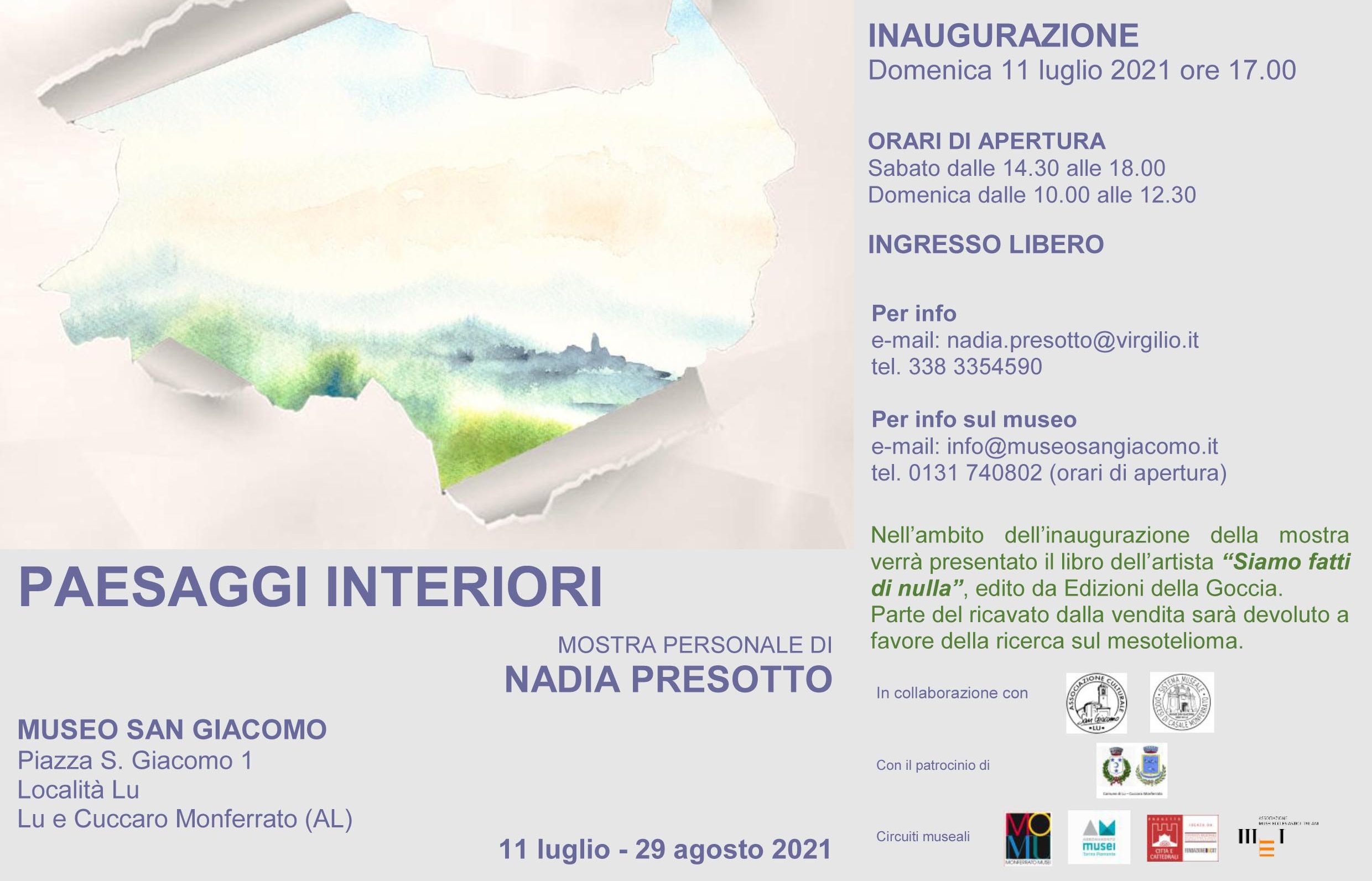 Doppio evento per Nadia Presotto che, in occasione dell’inaugurazione della personale “Paesaggi interiori”, allestita preso il Museo San Giacomo di Lu Monferrato, domenica 11 luglio alle ore 17 presenterà anche il suo libro “Siamo fatti di nulla” che sostiene la ricerca sul Mesotelioma.