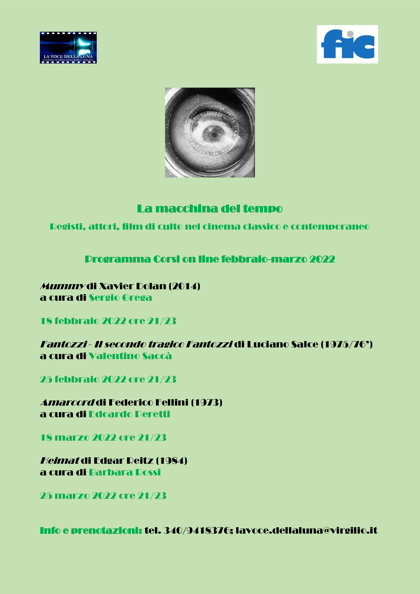 Il ciclo formativo, dal titolo “La macchina del tempo. Registi, attori, film di culto nel cinema classico e contemporaneo”, si propone di fornire ai corsisti gli strumenti critici per una più approfondita conoscenza dei temi, degli stili di regia e di recitazione, delle marche narrative principali del cinema classico e contemporaneo, grazie al lavoro analitico svolto dai critici e saggisti di cinema responsabili di ciascun laboratorio. In particolare, il presente ciclo di incontri intende affrontare l’analisi di alcune pellicole fortemente rappresentative della poetica di un cineasta o di un determinato periodo o genere cinematografico. L’organizzazione dei corsi è a cura di Barbara Rossi, media educator, critico cinematografico, presidente della Voce della Luna e vicepresidente FIC.