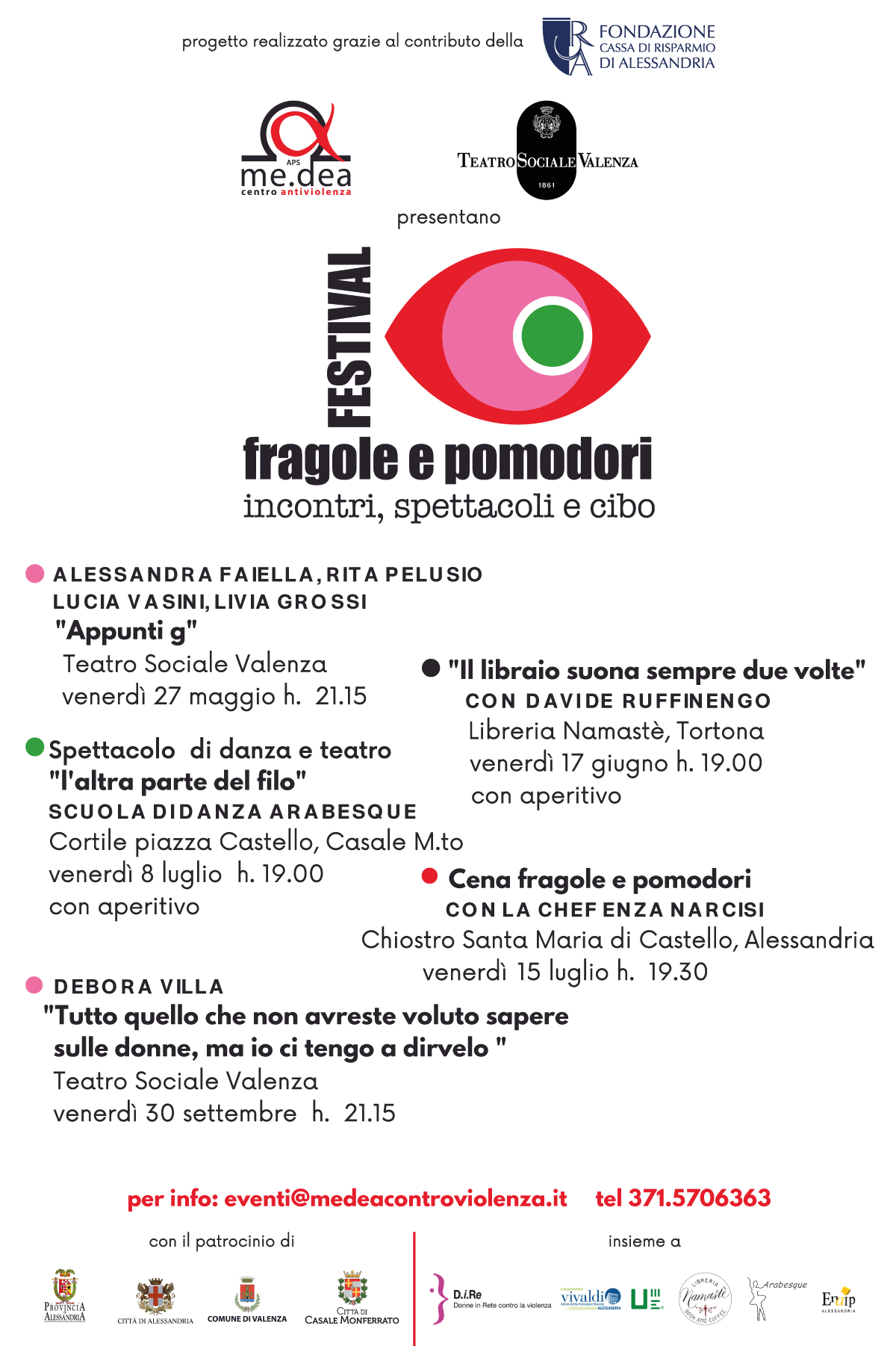 Si stanno per accendere i riflettori sulla prima edizione del Festival Fragole e Pomodori, promosso dall’Aps me.dea e dal Teatro Sociale di Valenza, sotto la direzione artistica di Mara Mayer, socia medea. Il Festival è realizzato con il contributo della Fondazione Cassa di Risparmio di Alessandria e gode del patrocinio della Provincia di Alessandria, dei Comuni di Alessandria, Valenza e Casale Monferrato, della rete nazionale dei centri antiviolenza D.i.Re di cui me.dea fa parte e della fattiva collaborazione di una serie di attori del territorio: Conservatorio A. Vivaldi di Alessandria, Università delle Tre Età Alessandria, Libreria Namastè, A.S. Arabesque, Enaip Alessandria.
