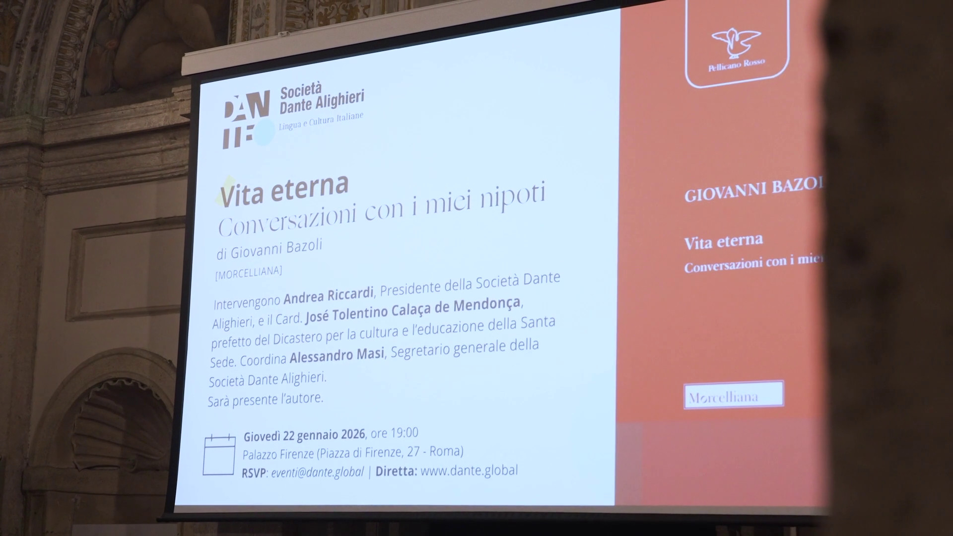 Il dialogo, che si è svolto presso la sede della Società Dante Alighieri a Roma, si è allargato alla dimensione civile e culturale del libro, mettendo al centro l’ascolto e la possibilità di ricomporre legami in un’epoca spesso frammentata. Sono intervenuti Andrea Riccardi, Presidente della Società Dante Alighieri, e il Cardinale José Tolentino de Mendonça, Prefetto del Dicastero per la Cultura e l’Educazione, offrendo le loro prospettive e riflessioni, che coniugano tradizione e contemporaneità.