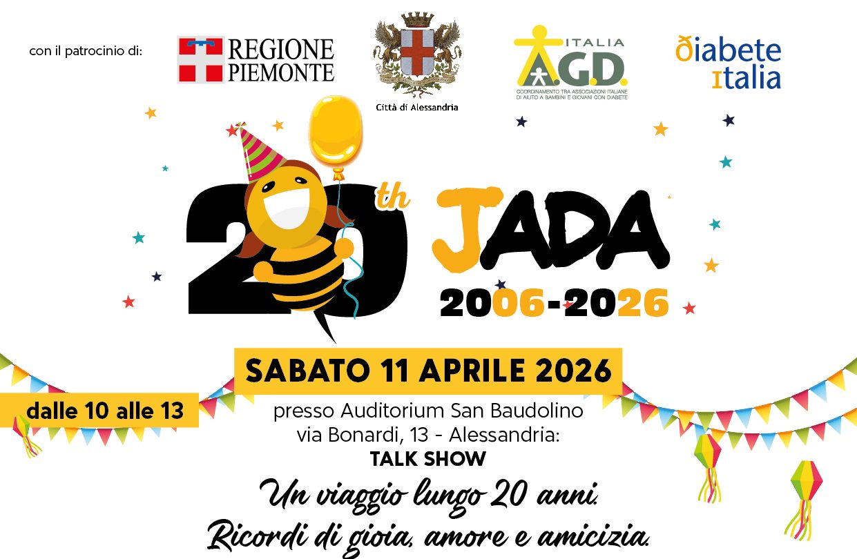 Venti anni di coraggio, cura e speranza: l’Associazione Jada celebra una storia che cambia la vita Ci sono anniversari che vanno oltre la semplice ricorrenza: diventano simboli, emozioni condivise, storie intrecciate. Sabato 11 aprile 2026 sarà uno di quei giorni speciali, perché l’Associazione J.A.D.A. ODV – Junior Associazione Diabete Alessandria – festeggia i suoi primi vent’anni con una grande festa, carica di significato e di gratitudine, che si terrà all’Auditorium San Baudolino del Quartiere Cristo, dalle 10 alle 13. A seguire il pranzo presso il Centogrigio (€ 15).