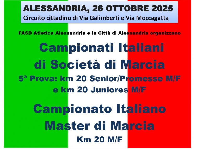 Domenica prossima, 26 ottobre Alessandria sarà teatro del Campionato di Società di Marcia (C.D.S.) 5^ Prova: km 20 Sen/Pro M/F – km 20 Jun M/F e del Campionato Italiano Individuale Master: 20 Km M/F, che verranno disputati dalle ore 9 alle 13 circa nei pressi del Campo di Atletica in Alessandria.