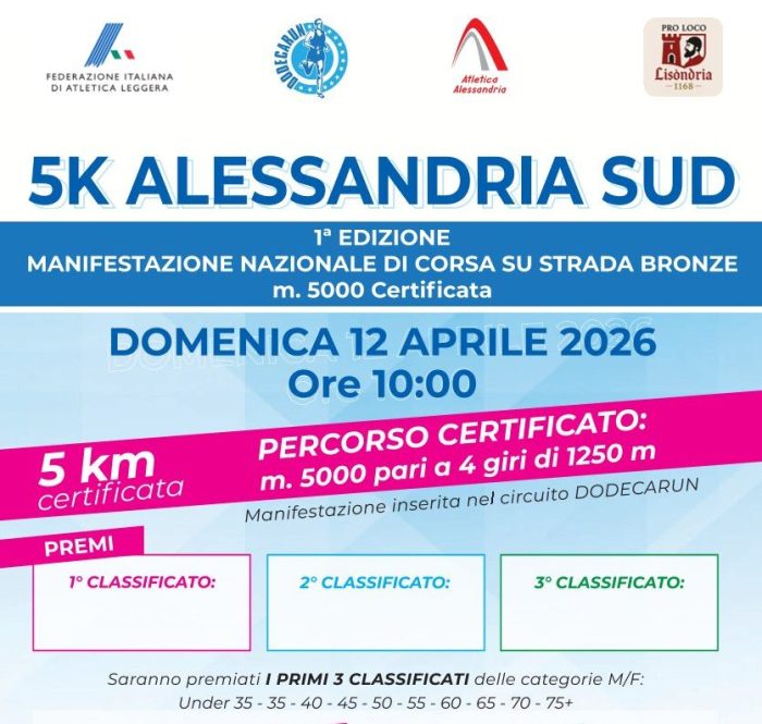 Un percorso ad anello di 1.250 metri da percorrere 4 volte: è questo il tracciato della prima edizione della 5km di Alessandria Sud, prova nazionale di corsa su strada su percorso certificato FIDAL e 4^ tappa del circuito Dodecarun. La gara, organizzata dall’Atletica Alessandria con la regia di Giorgio e Steve Goggi, ideatori del Dodecarun, e di Monica Bogliolo, che ha sposato l’idea coinvolgendo Pro Loco Lisòndria 1168, Associazione Attività e Commercio del quartiere Cristo e l’Associazione Alessandria Sud.